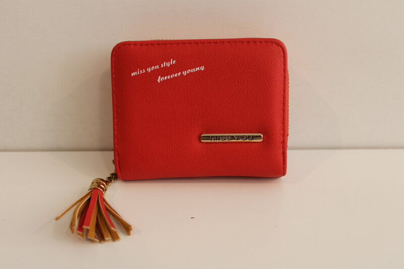 Manjša denarnica z dvema predalčkoma, ki se zapenjata z zadrgo, ter predalom za kartice in bankovce  z zapenjanjem na gumbek.