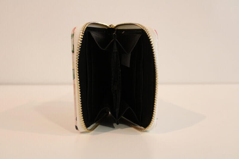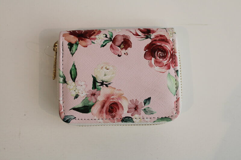 Manša denarnica z cvetličnimi vzorci na zadrgo. Denarnica je dovolj prostorna za bankovce in kovance imapa tudi predal za kartice.