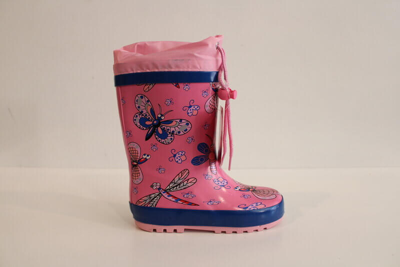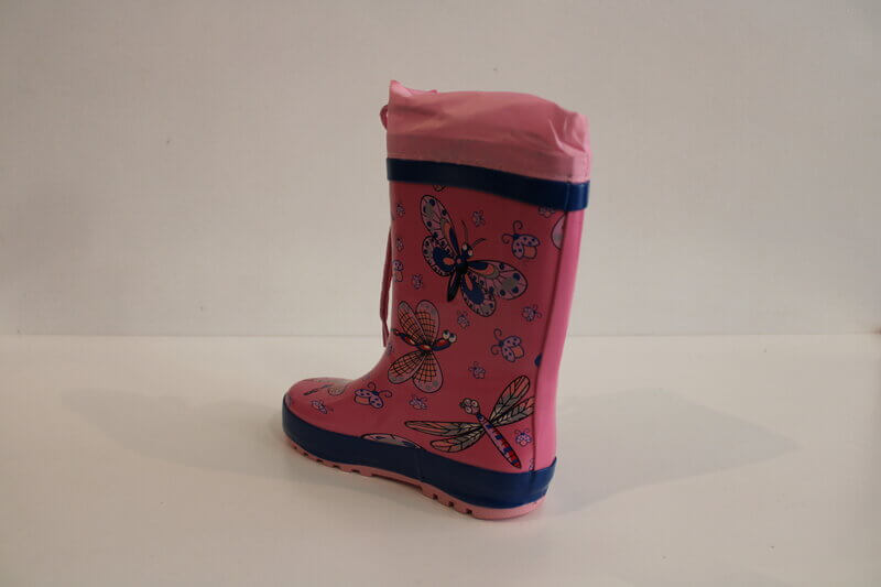 Nepremočljiv gumijast škorenj z potiski metuljčkov. Škorenj ni podložen.