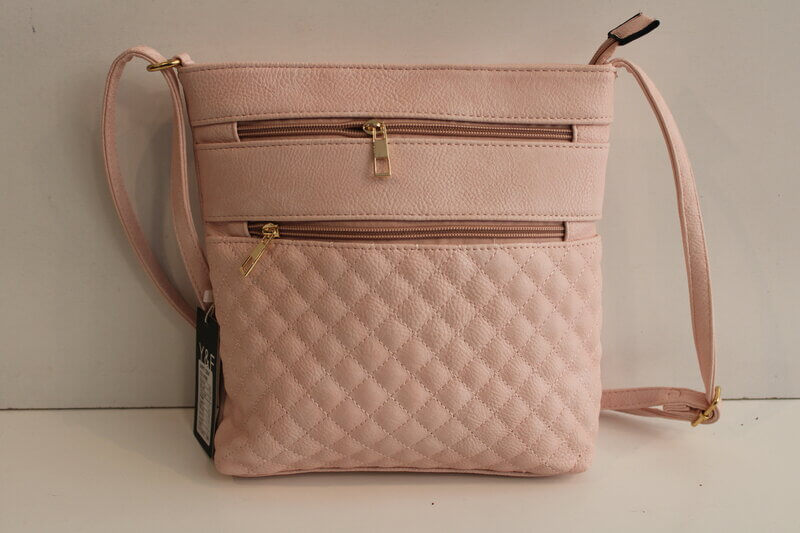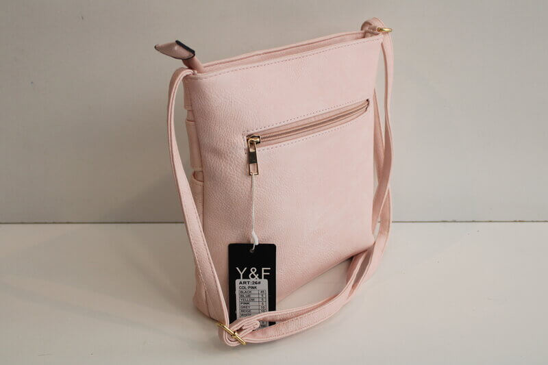 Roza torbica z nastevljivo naramnico. Torbica ima v notranjosti še tri manjše žepke. Velikost: 25×25 cm.
