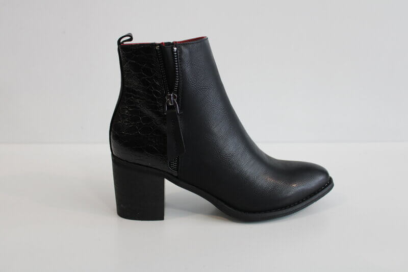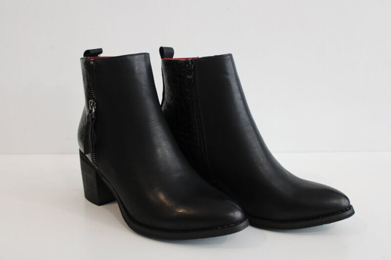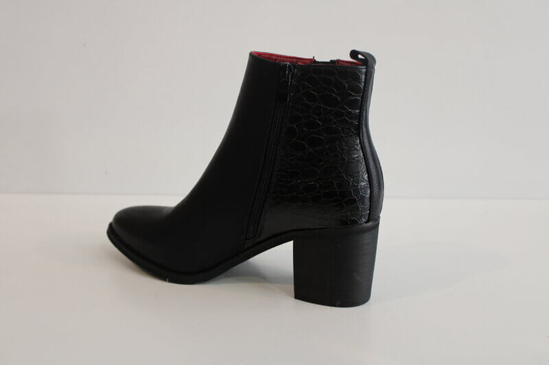 Eleganten gležnar z široko peto, visoko le 6 cm, zato je primeren tudi za tiste katere pet niste najbolj vajene. Na obeh straneh ima zadrgo, zadnji del gležnarja pa ima lakast vzorec.